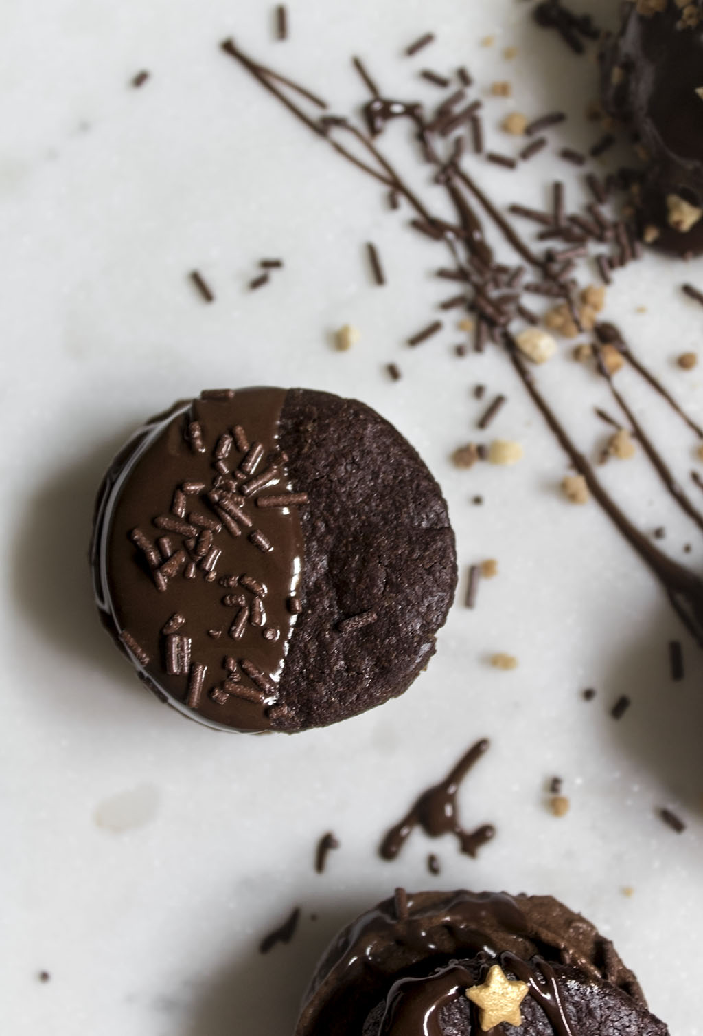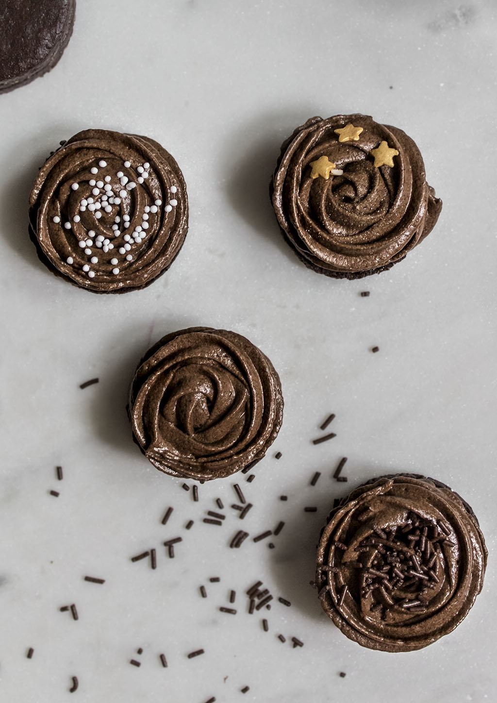 • Pon la manga perpendicular a la galleta, y comienza a hacer círculos concéntricos, abriendo cada pasada un poquito más. Como para hacer rosas en los cupcakes. Después sprinkles, azúcar de sabores, virutas de chocolate, nueces picadas, almendras crocante, fideos de chocolate ¿Sigo?