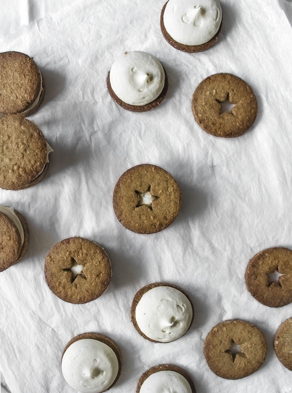 La versión original de la receta combina estas galletas tan dulces con una crema de relleno hecha con ruibarbo asado. Me imagino que debe irles genial y cualquier otro relleno cremoso y algo ácido sería una buena idea porque complementará el sabor dulce de las galletas.