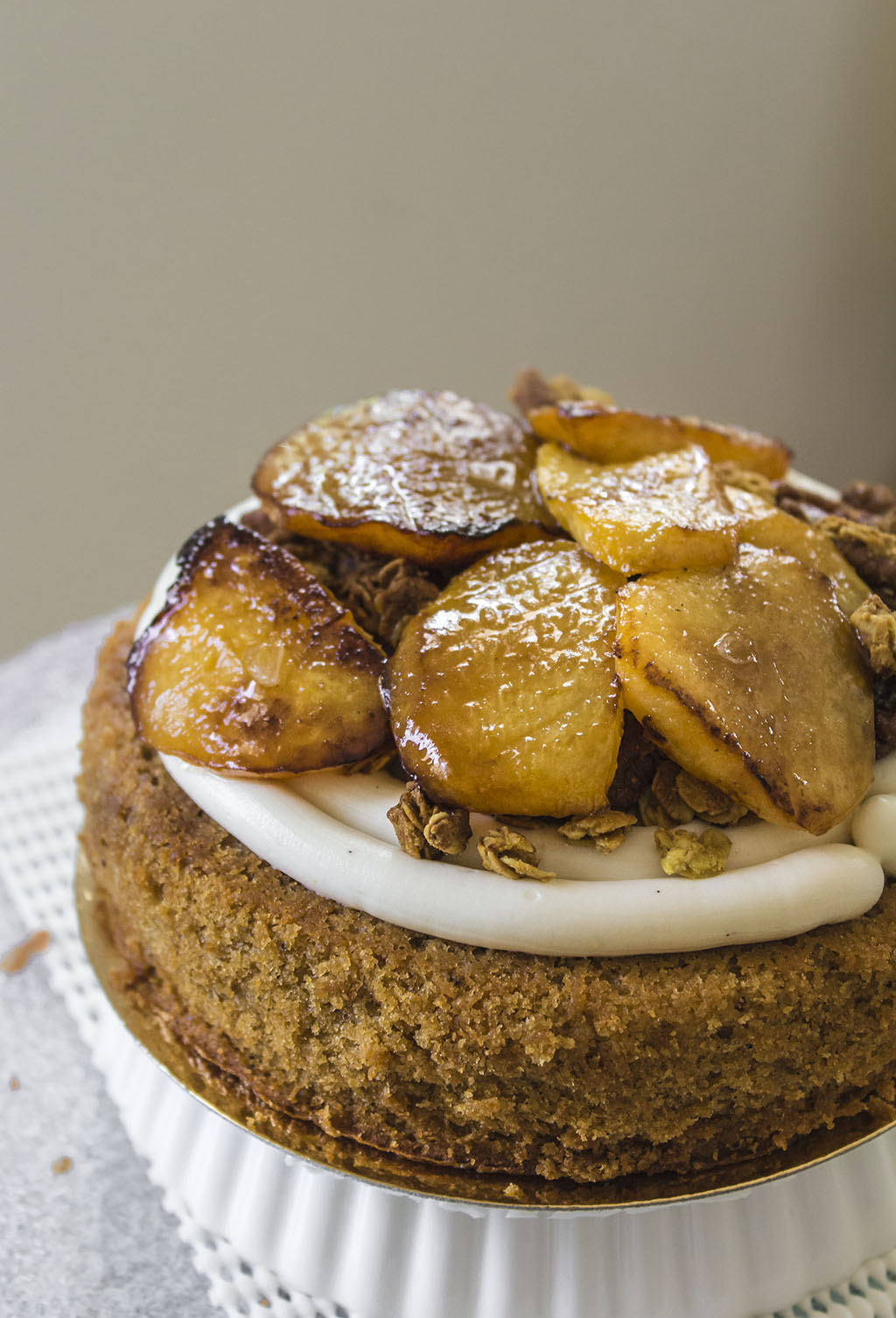 El relleno quedó muy gracioso. Crema de chocolate blanco: Swiss Merengue Buttercream de chocolate blanco -mi más favorita cosa all over the world-, granola de cúrcurma y pecanas, para no dejar fuera el crujiente y melocotones -ligeramente, poco– fritos en aceite de oliva. No demasiado cocinados, sólo hasta que se doren las esquinitas y queden suaves.
